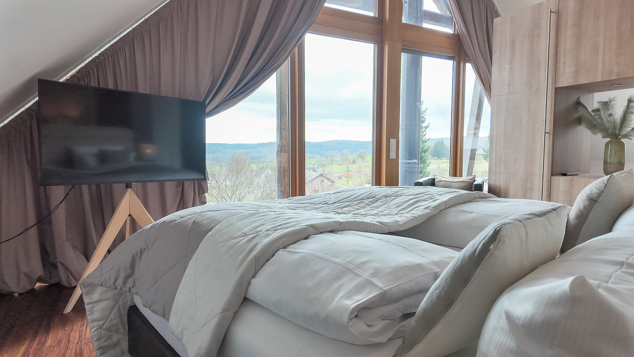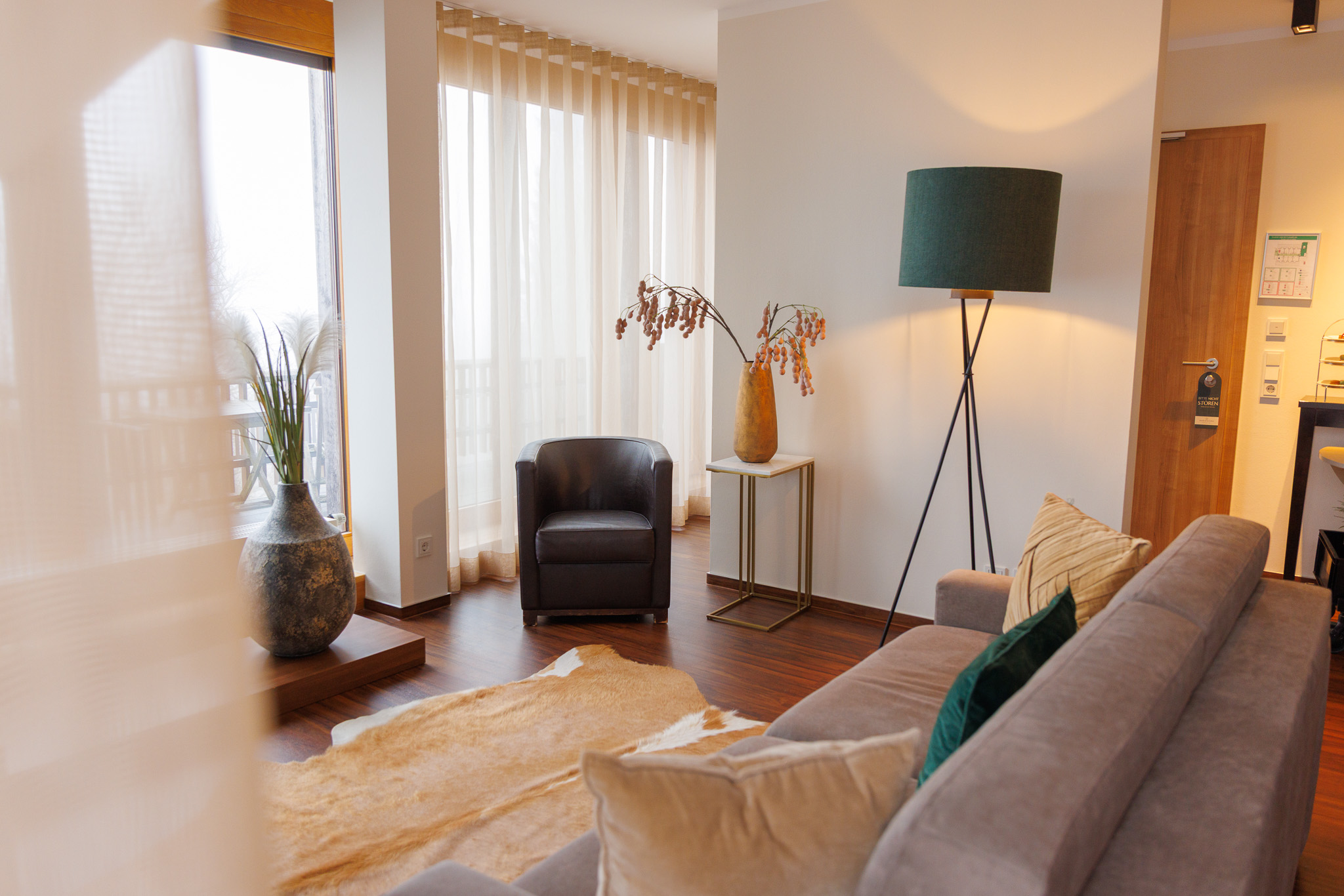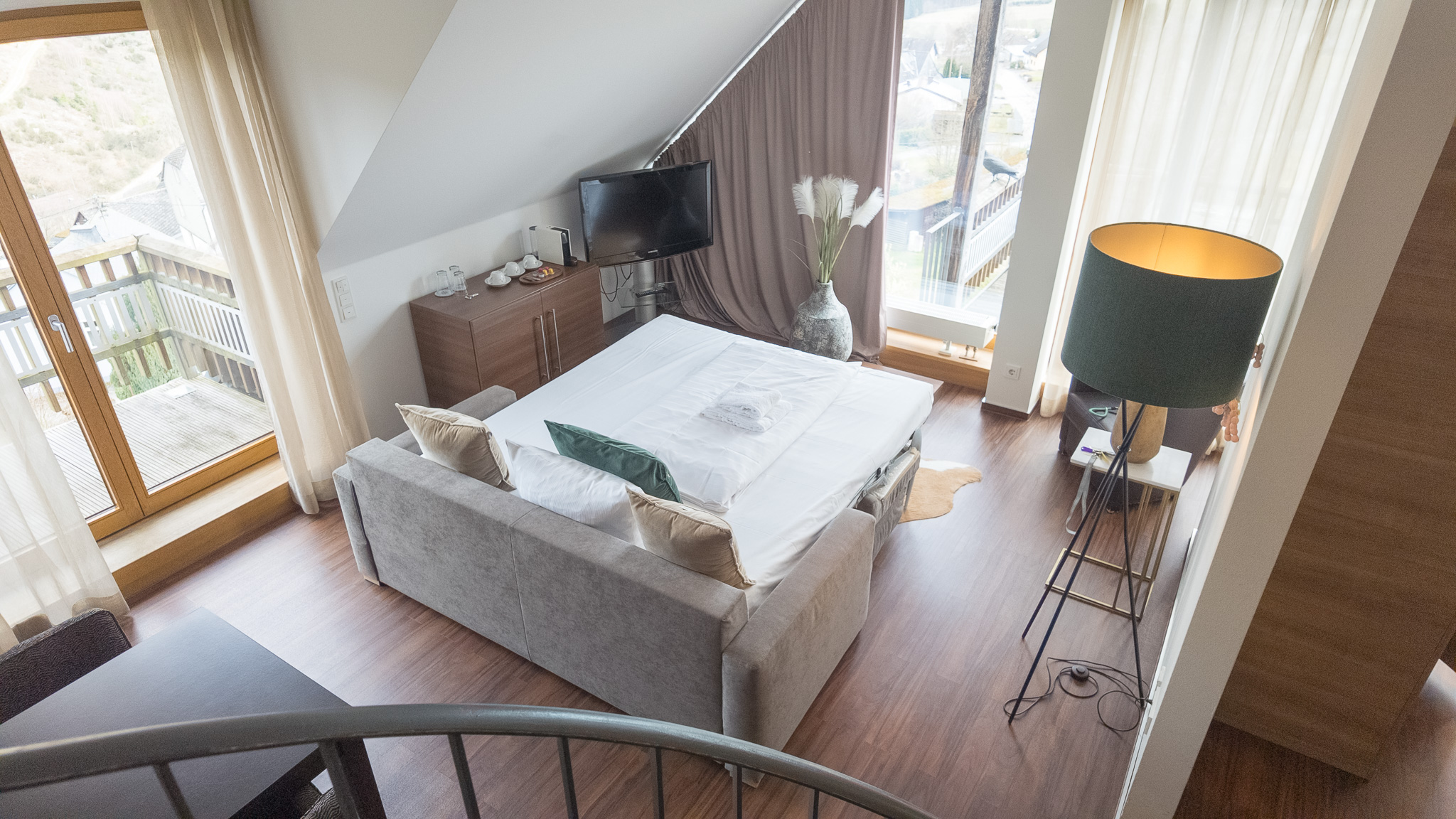 Diese außergewöhnlichen Maisonette-Suiten im Hauptgebäude mit freistehender Badewanne, Blick zum Steinbach-Stausee, Loggia, getrenntem Wohn- und Schlafbereich, bieten Entspannung pur, viel Platz und ebenso viel Privatsphäre. Alle Zimmer verfügen über eine besondere Ausstattung. Unter anderem hochwertig ausgestattete Betten für erholsamen Schlafkomfort, sowie L‘Occitane Pflegeprodukte.