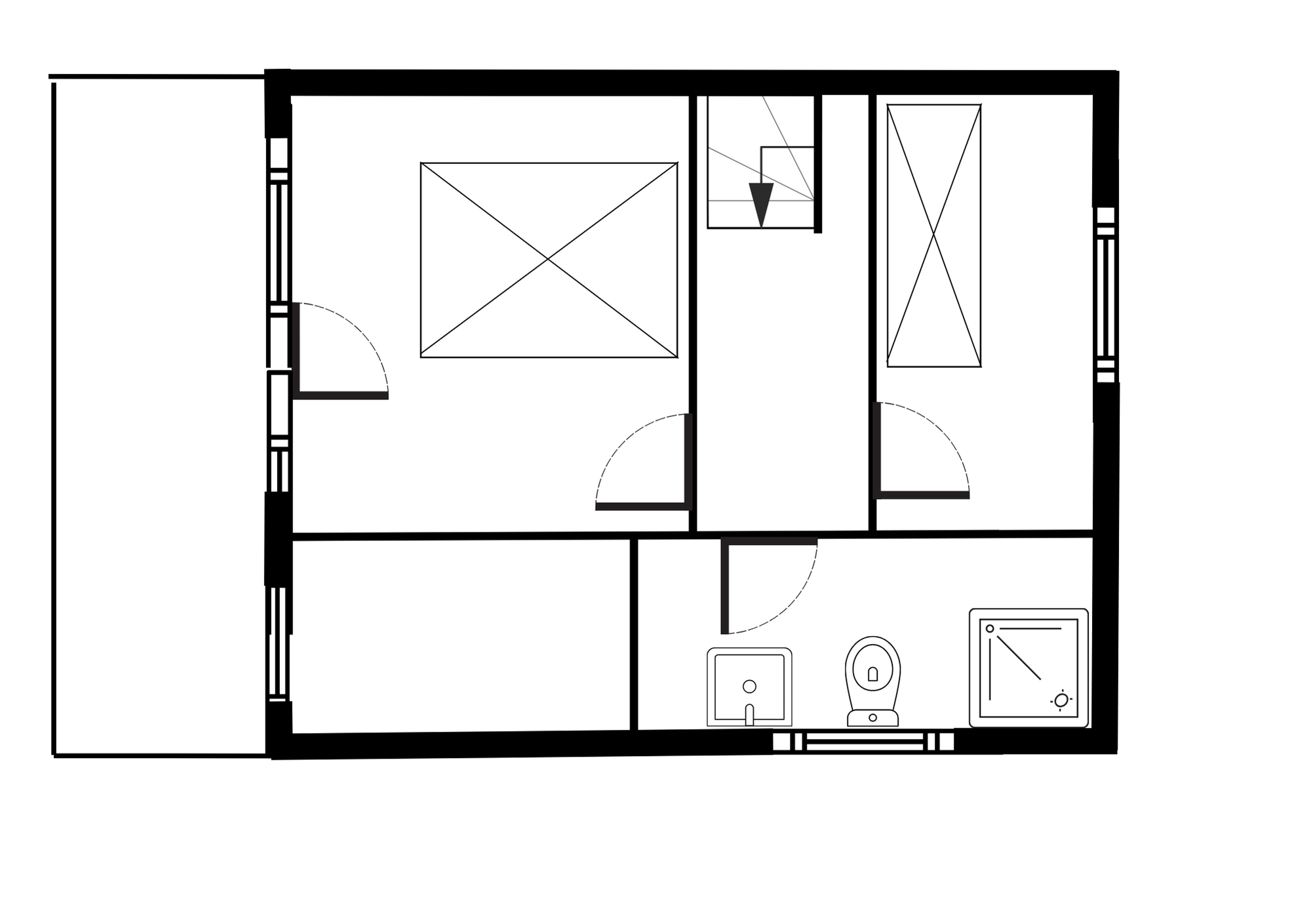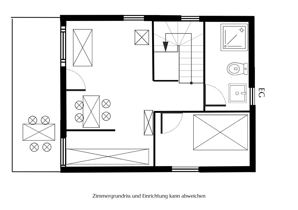 Kleine Küche-/Wohnbereich mit Kamin & TV • 1 Doppelzimmer mit Doppelbett • 1 Bad mit Dusche • Terrasse